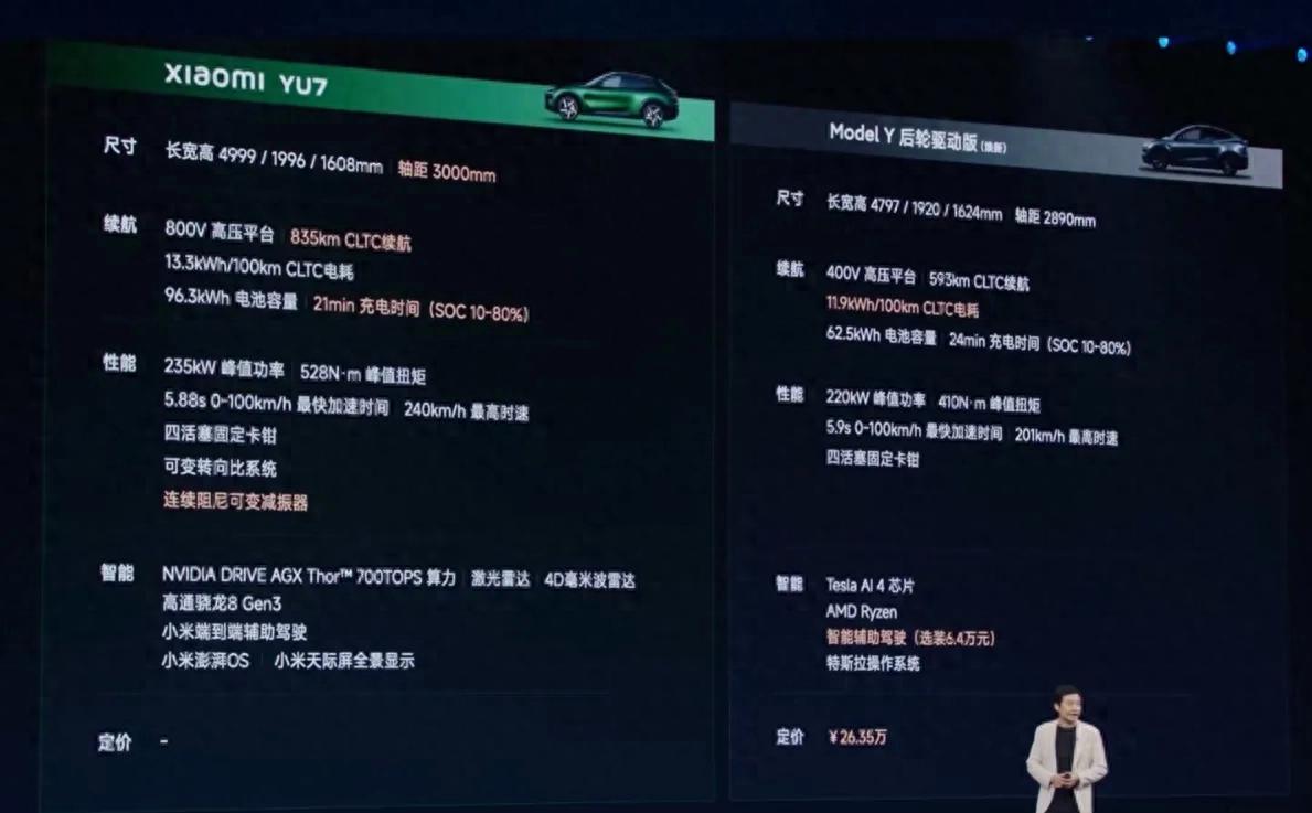 接下來我們看看雷軍發布會與特斯拉的對比圖,我們可以看到特斯拉的續航和性能是遠不如yu7的,特斯拉的定價是26.35萬,那么大家不妨可以猜猜yu7的定價……