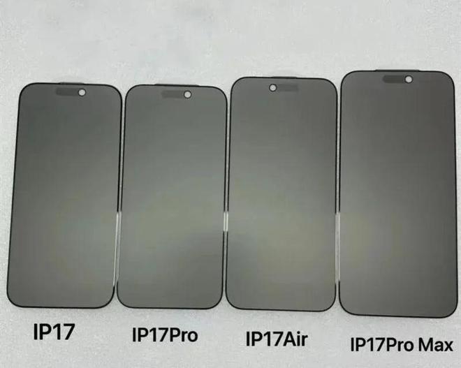 先從外觀鏡頭來說,在曝光的iPhone17系列貼膜對比圖中,iPhone17、Pro和Pro Max三款機型堅守傳統,前置攝像頭(Face ID組件的一部分)穩穩居于屏幕頂部的右側區域。
