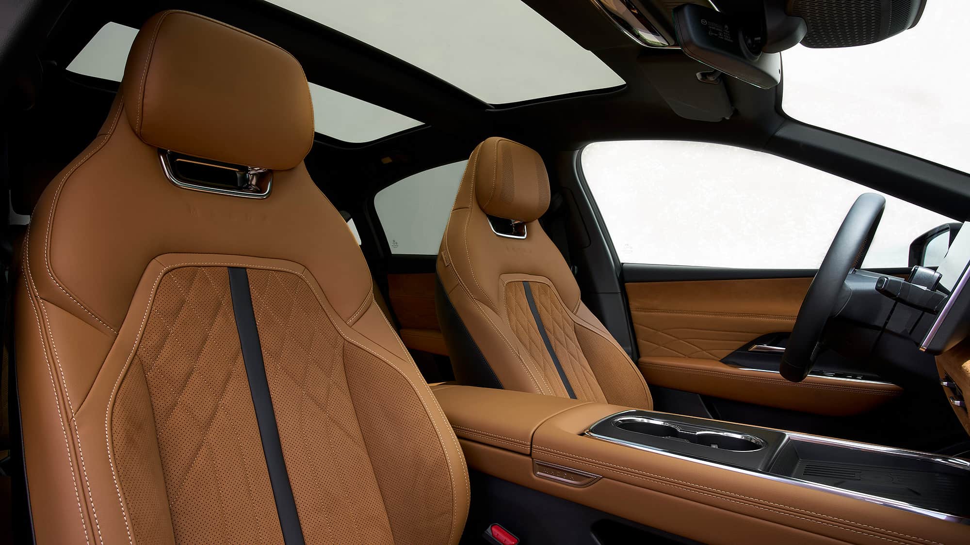 后排乘客可通過觸控面板控制玻璃天窗遮陽簾和獨立空調。座椅體驗如何?乘坐的坐姿非常低,前排座椅下沒有太多腳部空間,但腿部空間還算充裕。