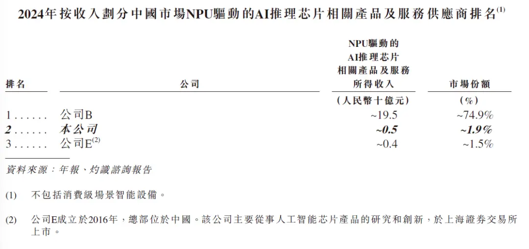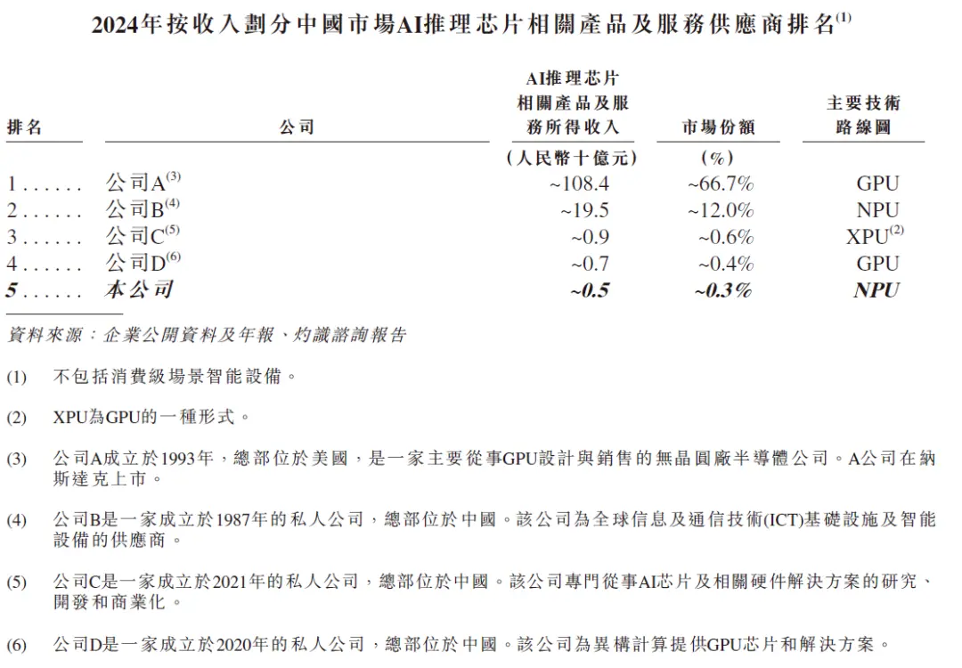 從招股書的注釋中推斷,在2024年中國市場AI推理芯片相關產品及服務供應商排名的表中,公司A和B是英偉達和華為,公司C和D大概率是百度昆侖芯和沐曦。在另一張NPU市場排名的表中,公司E是寒武紀。