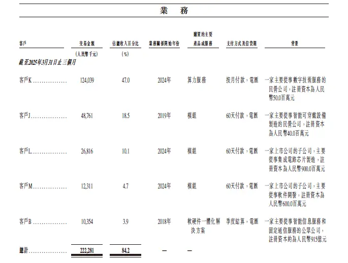 關于這部分業務具體出貨做什么,云天勵飛并未解釋。但我們能知道的是,這部分的營收一半由單一大客戶貢獻。作為佐證,在2024年的前五大客戶中,客戶K買了1.1億的算力服務,占整個業務收入占比的44%。2025年一季度,客戶K基本上承包了所有的營收。