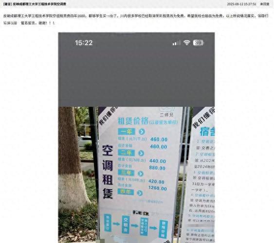 2025年8月,成都理工大學工程技術學院學生反映,宿舍空調(diào)需繳納四年租金1680元,費用遠超同類高校免費標準,甚至接近購買新空調(diào)價格(1.5匹掛機約1500-2000元)。該事件引發(fā)全網(wǎng)對高校后勤服務外包模式的質(zhì)疑,學生呼吁免費使用空調(diào)的訴求持續(xù)發(fā)酵。