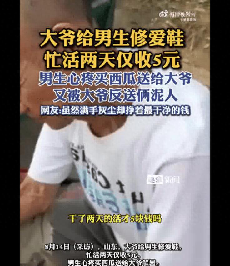 山東街頭暖心一幕:修鞋大爺兩天只收5元,小伙買西瓜回贈(zèng)獲泥人