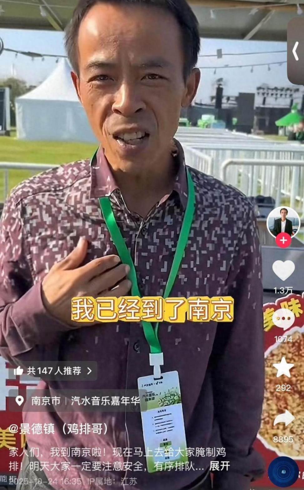 10月24日下午4時許,“雞排哥”在社交賬號中更新視頻,“家人們,我到南京啦!現(xiàn)在馬上去給大家腌制雞排!”視頻里,他向鏡頭揮手,介紹自己已到達南京音樂節(jié)現(xiàn)場,準備進行腌制雞排等準備工作。