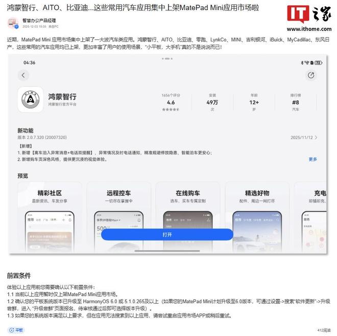 12 月 7 日消息,據華為官方團隊賬號 @智慧辦公產品經理 分享,MatePad Mini 小平板的應用市場近期集中上架了一波汽車類應用,包括鴻蒙智行、AITO、比亞迪、零跑、LynkCo、MINI、吉利銀河、iBuick、MyCadillac、東風日產等常用的汽車應用。