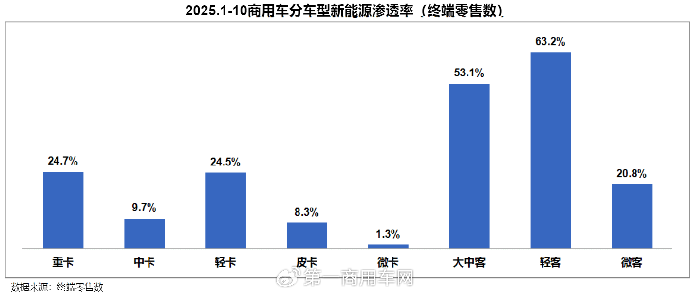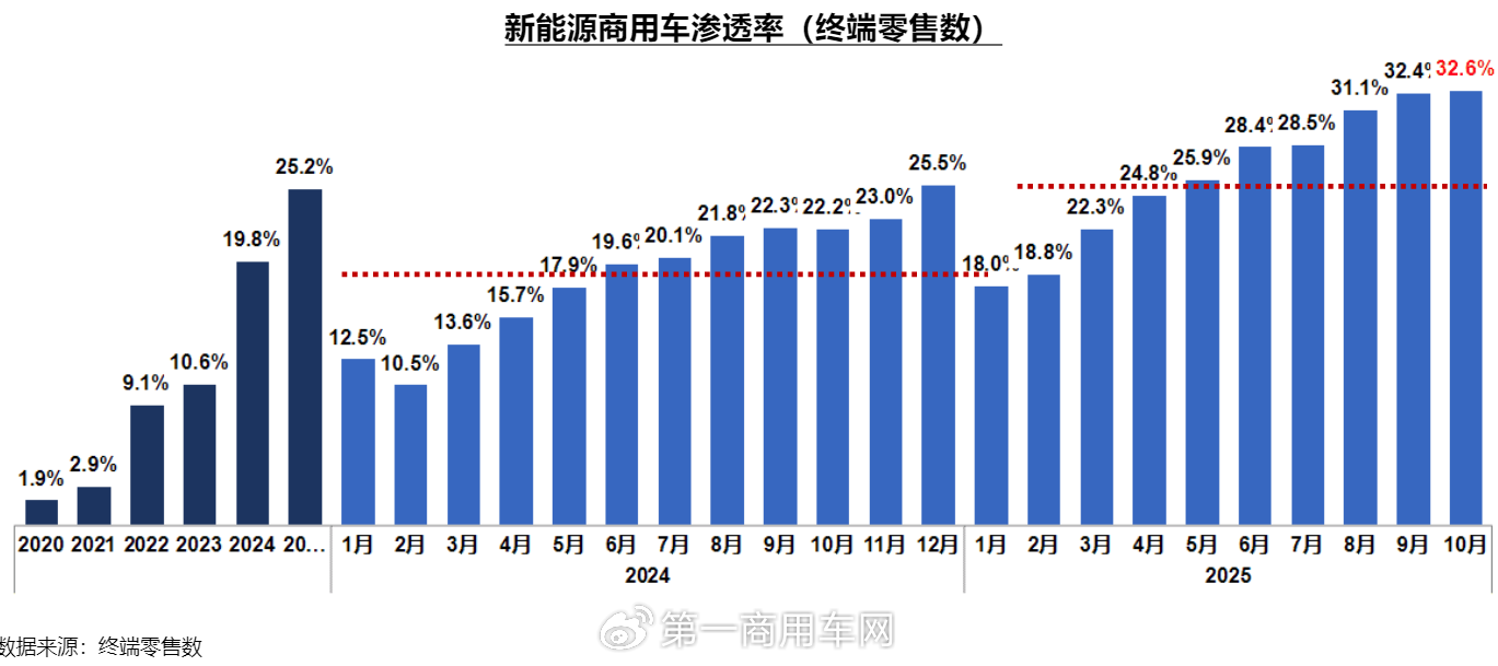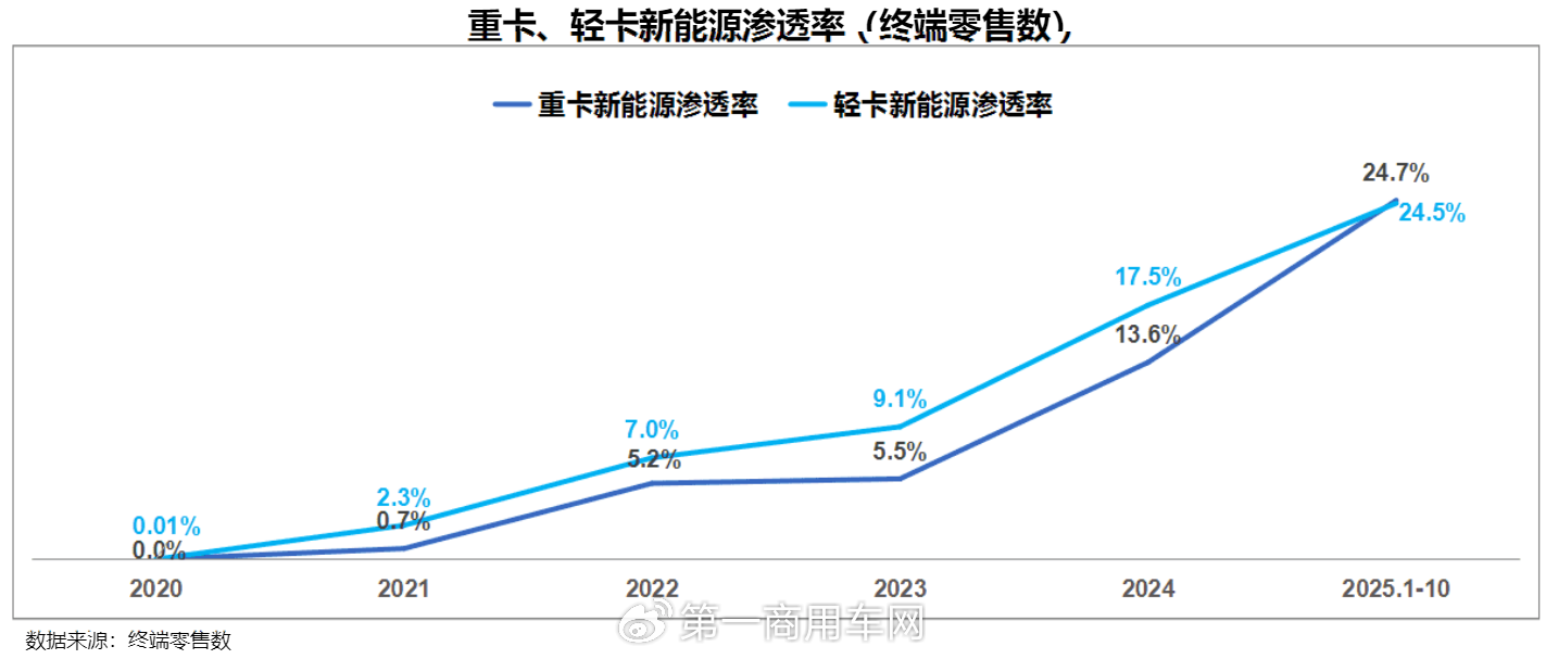 從終端零售數(shù)年度數(shù)據(jù)來看,2020年到2024年新能源商用車滲透率依次為1.9%、2.9%、9.1%、10.6%和19.8%,2024年相比2023年滲透率一下子增長了至少9個(gè)百分點(diǎn)。2025年1-10月,新能源商用車滲透率為25.2%,相比2024年全年增長了將近6個(gè)百分點(diǎn),電動(dòng)化轉(zhuǎn)型進(jìn)一步加速。